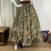 A nossa saia Alanis foi confeccionada com um mix de tecidos planos de alta qualidade. Sendo ela composta por uma saia de forro embaixo na cor verde musgo feita no cetim charmousse, com roda de 4,5m e a saia principal feita com um tule bordado floral com tons de marrom e com roda de 4,5m.