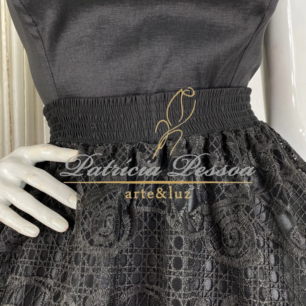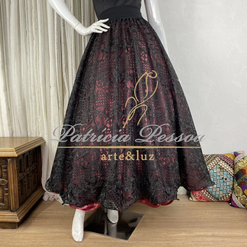 A nossa saia Ivy foi confeccionada com um mix de tecidos planos de alta qualidade. Sendo ela composta por uma saia de forro embaixo na cor preta feita no cetim charmousse, com roda de 4,5m e a saia principal feita com uma renda preta e com roda de 4,5m.