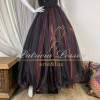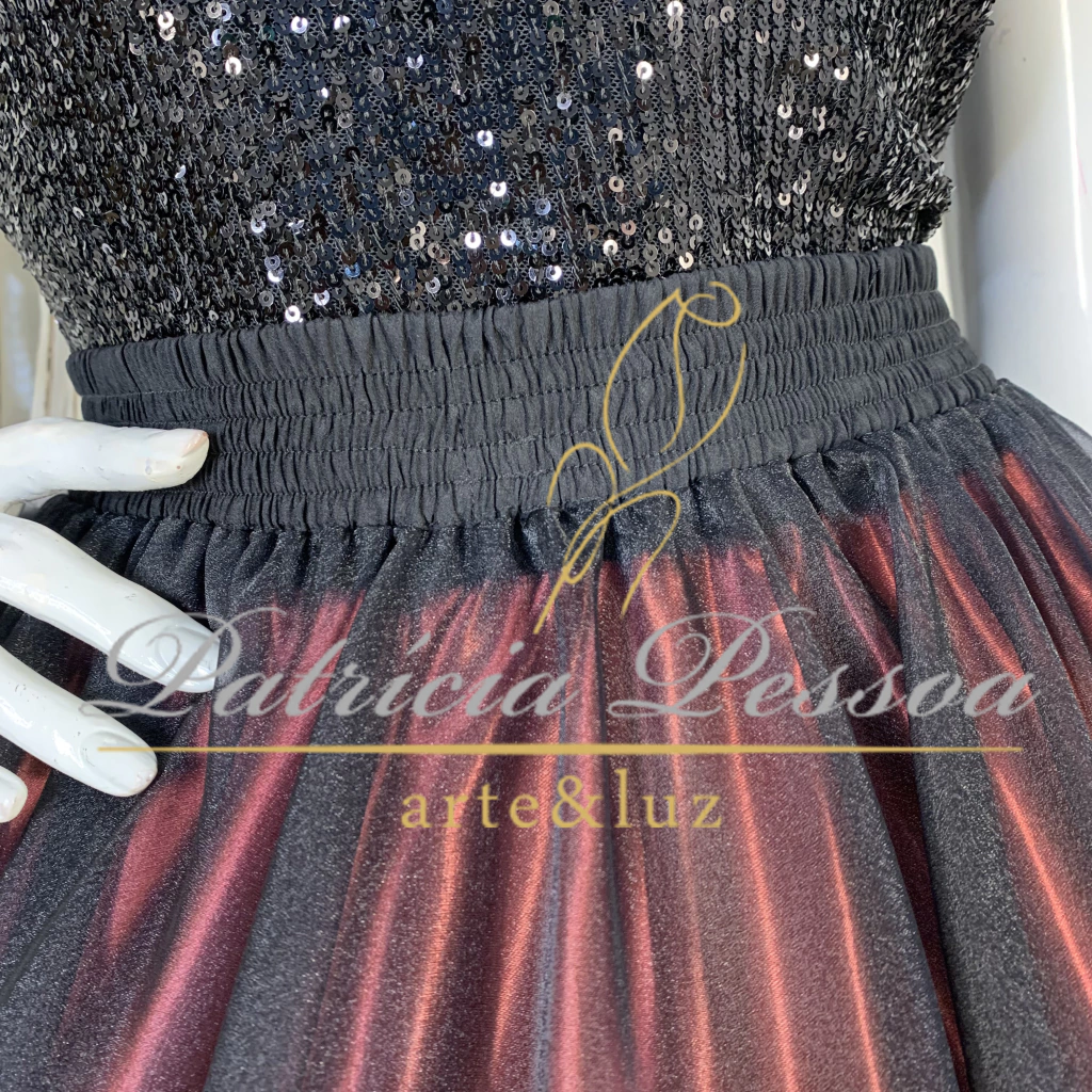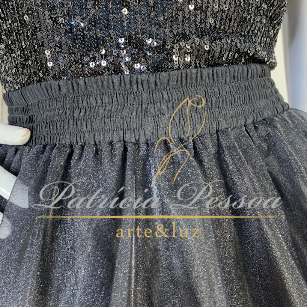 A nossa saia Livia foi confeccionada com um mix de tecidos planos de alta qualidade. Sendo ela composta por uma saia de forro embaixo na cor dourada, feita no cetim charmousse, com roda de 4,5m e a saia principal feita com organza na cor preta com roda de 9,0m.