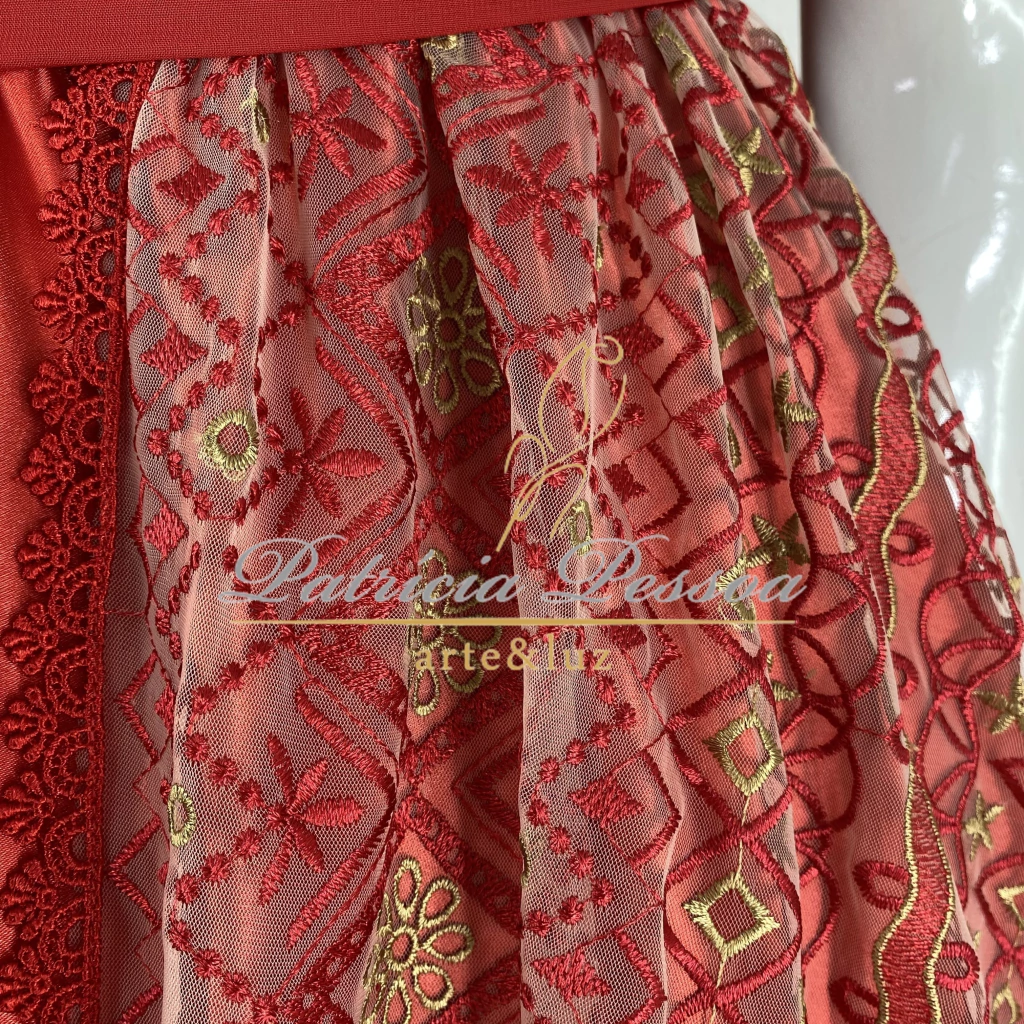 A nossa saia Matilda foi confeccionada com um mix de tecidos planos de alta qualidade. Sendo ela composta por uma saia de forro embaixo na cor vermelha, feita no cetim charmousse, com roda de 4,5m e a saia principal feita com tule bordado com abertura frontal e com roda de 4,5m.