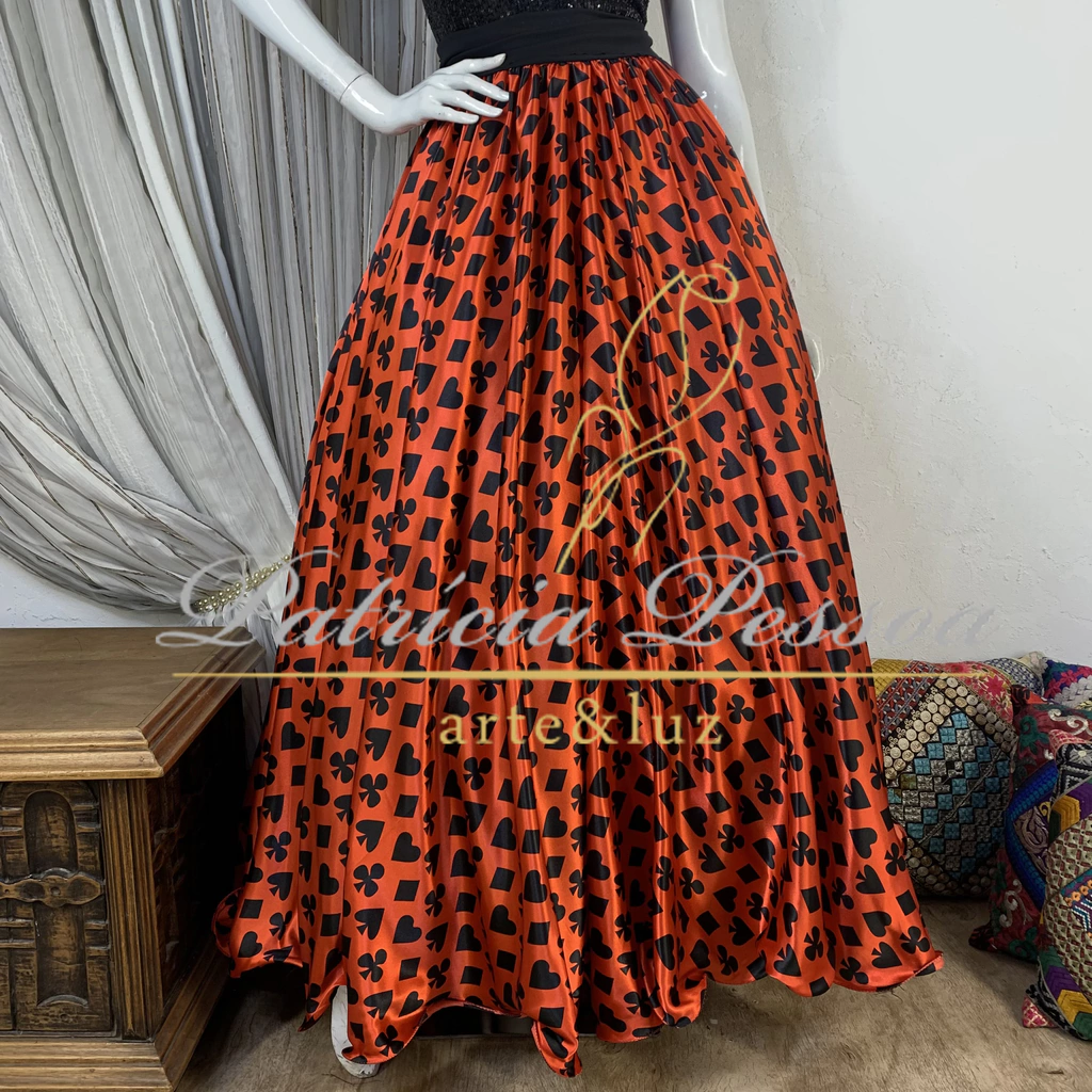 A nossa saia Rainha de Copas foi confeccionada com um mix de tecidos planos de alta qualidade. Sendo ela composta por uma saia de forro embaixo na cor preta feita no cetim charmousse, com roda de 4,5m e a saia principal estampada, feita no cetim charmousse, com roda de 9,0m.